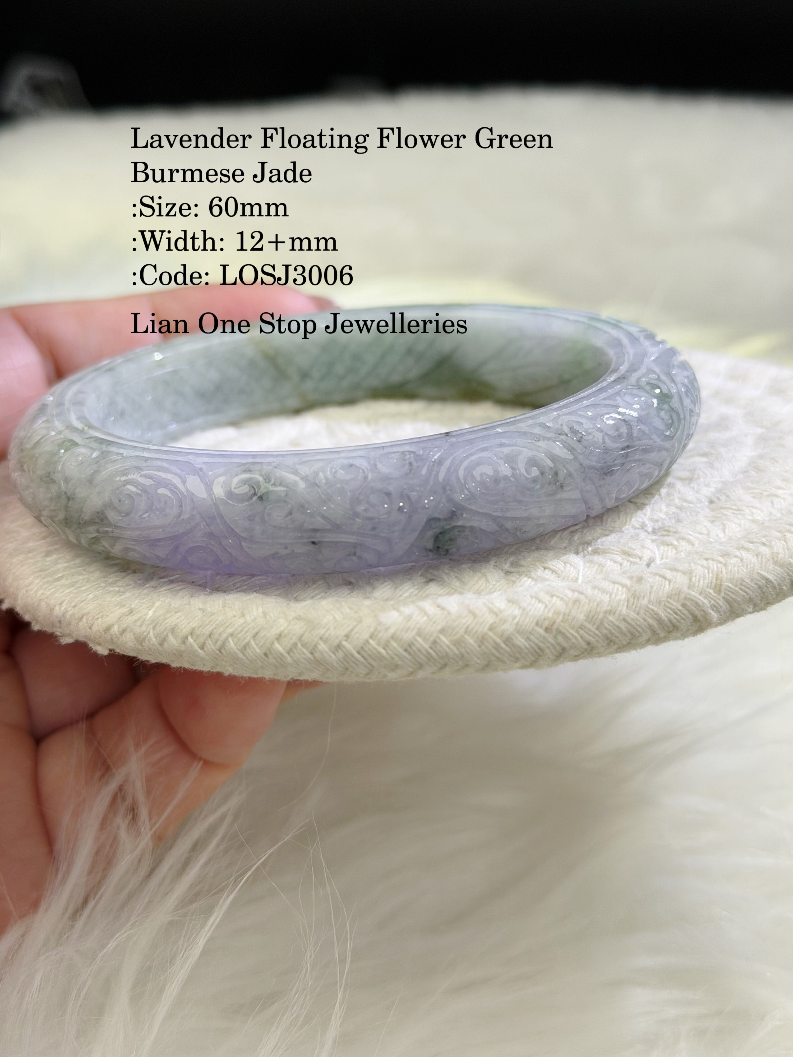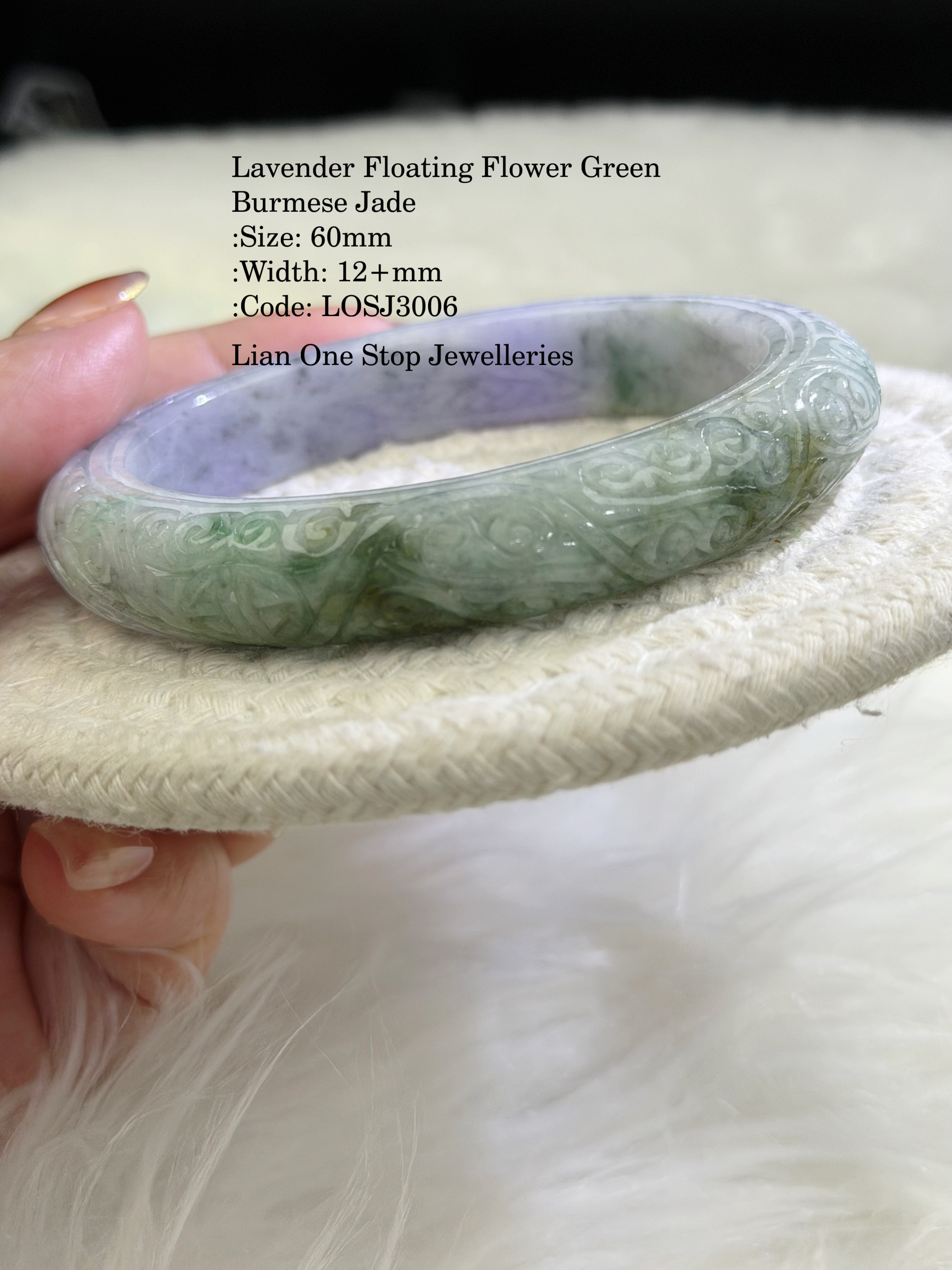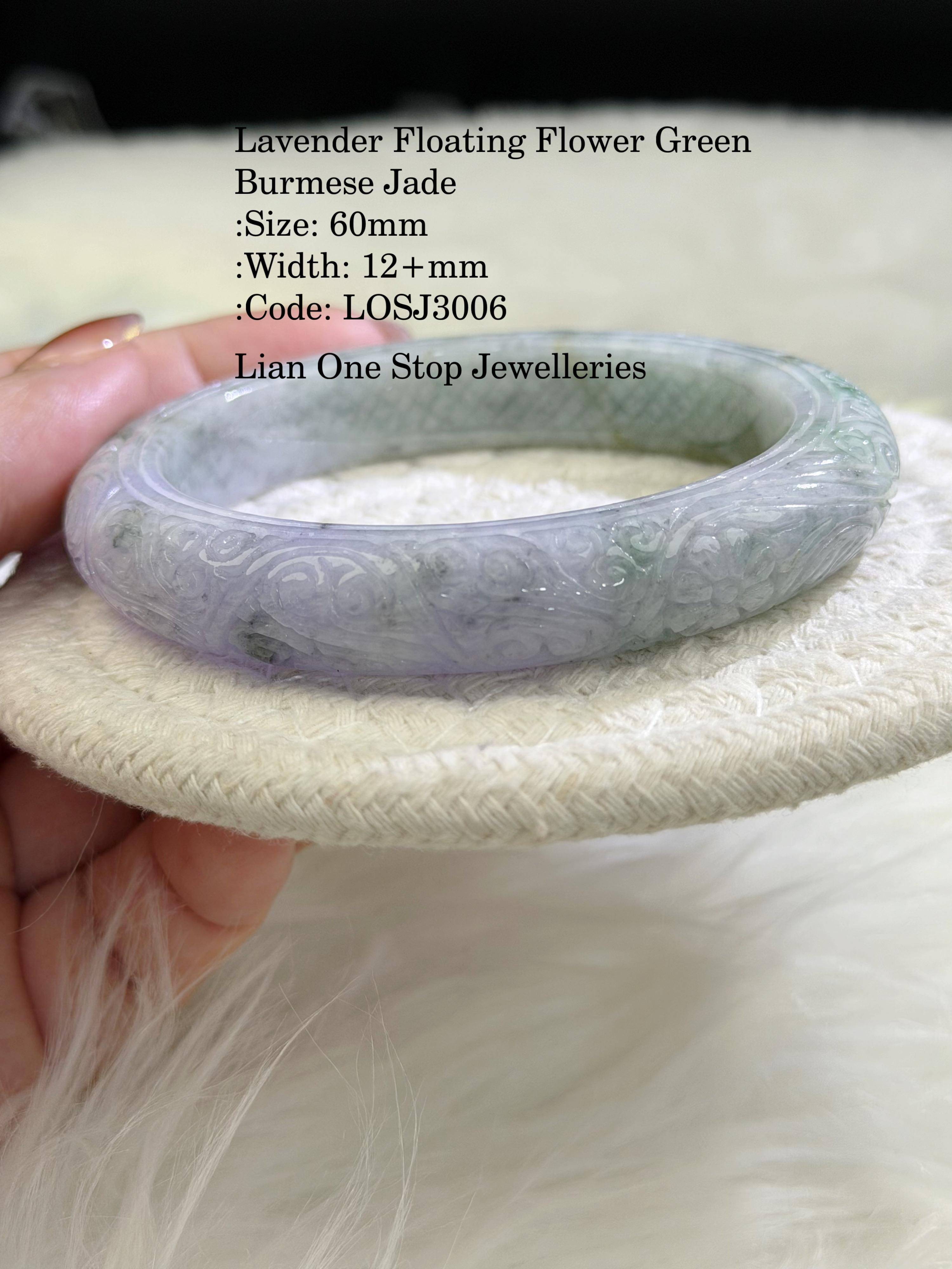 Lavender Floating Flower Green Burmese Jade :Size: 60mm :Width: 12+mm :Code: LOSJ3006 :Suitable for size 59, 60