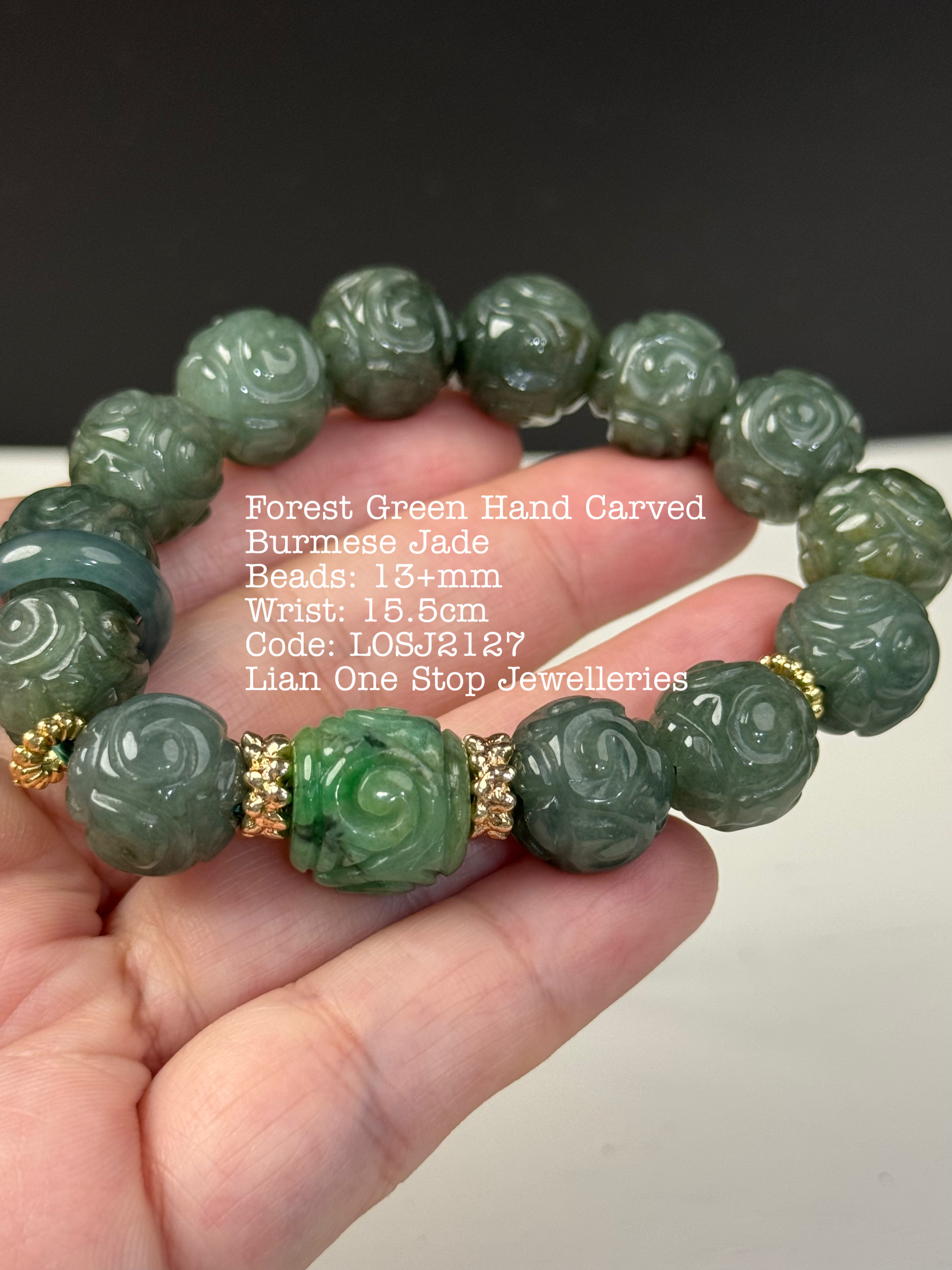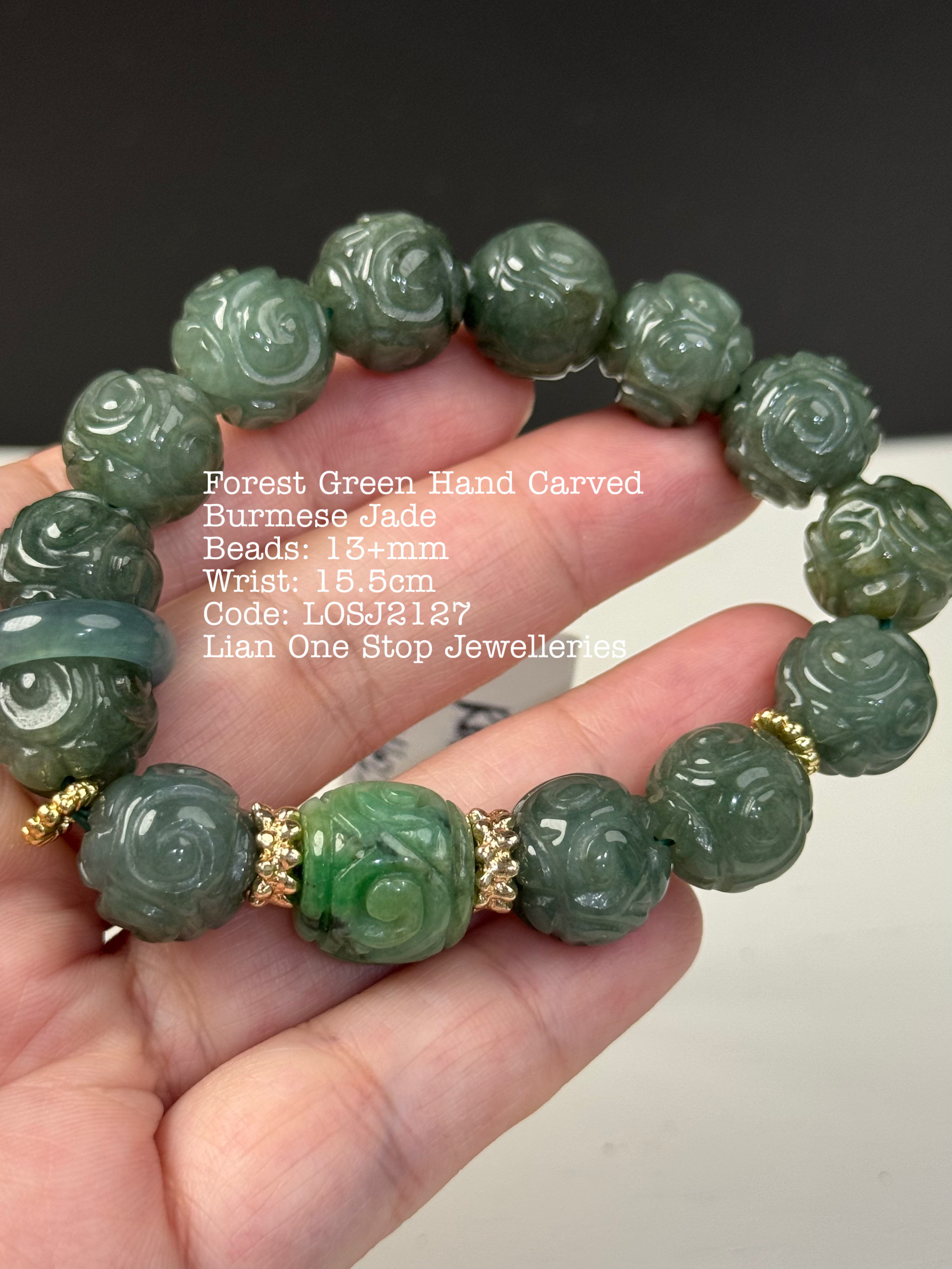Forest Green Hand Carved Burmese Jade Beads: 13+mm Wrist: 15.5cm Code: LOSJ2127