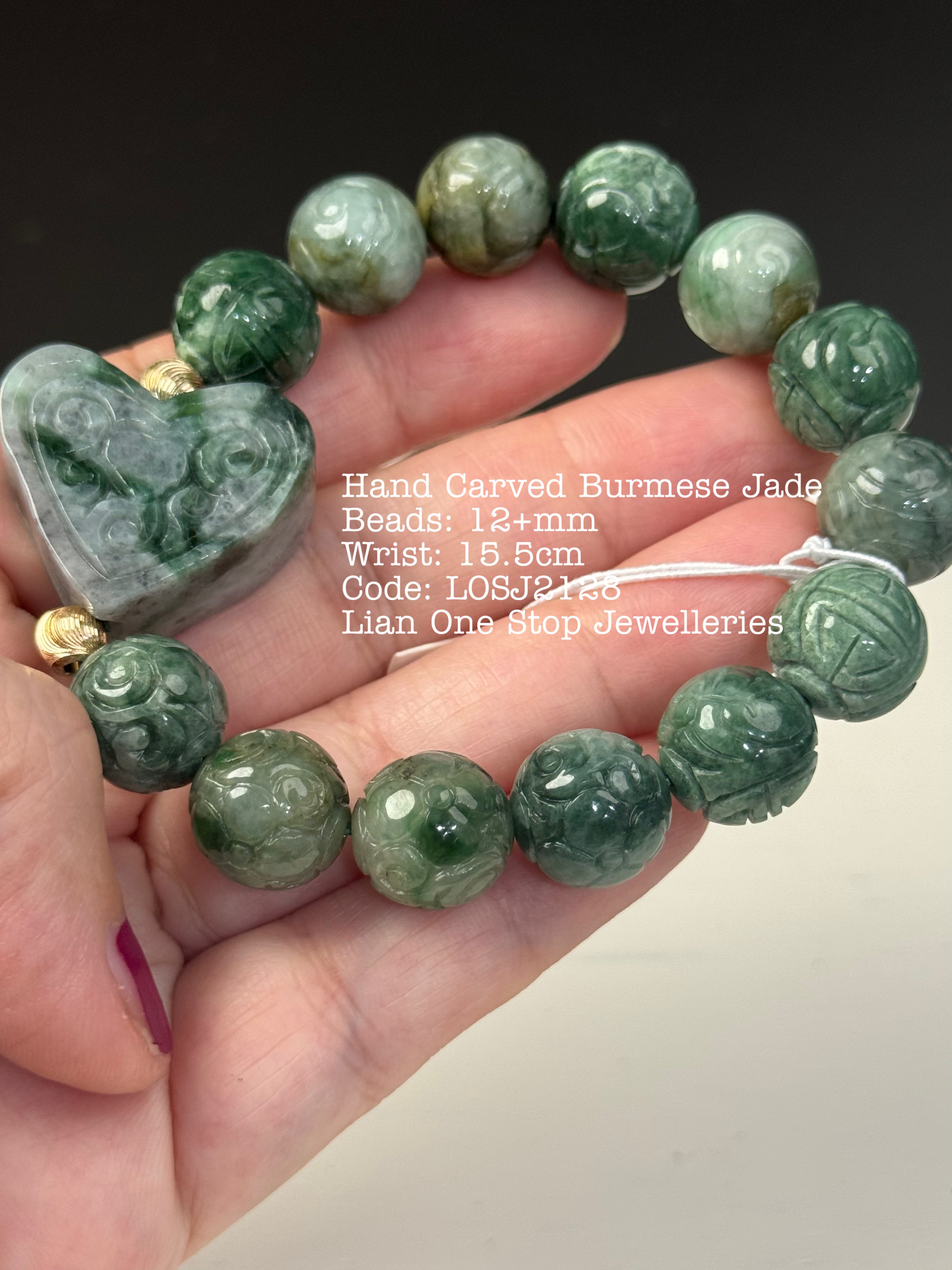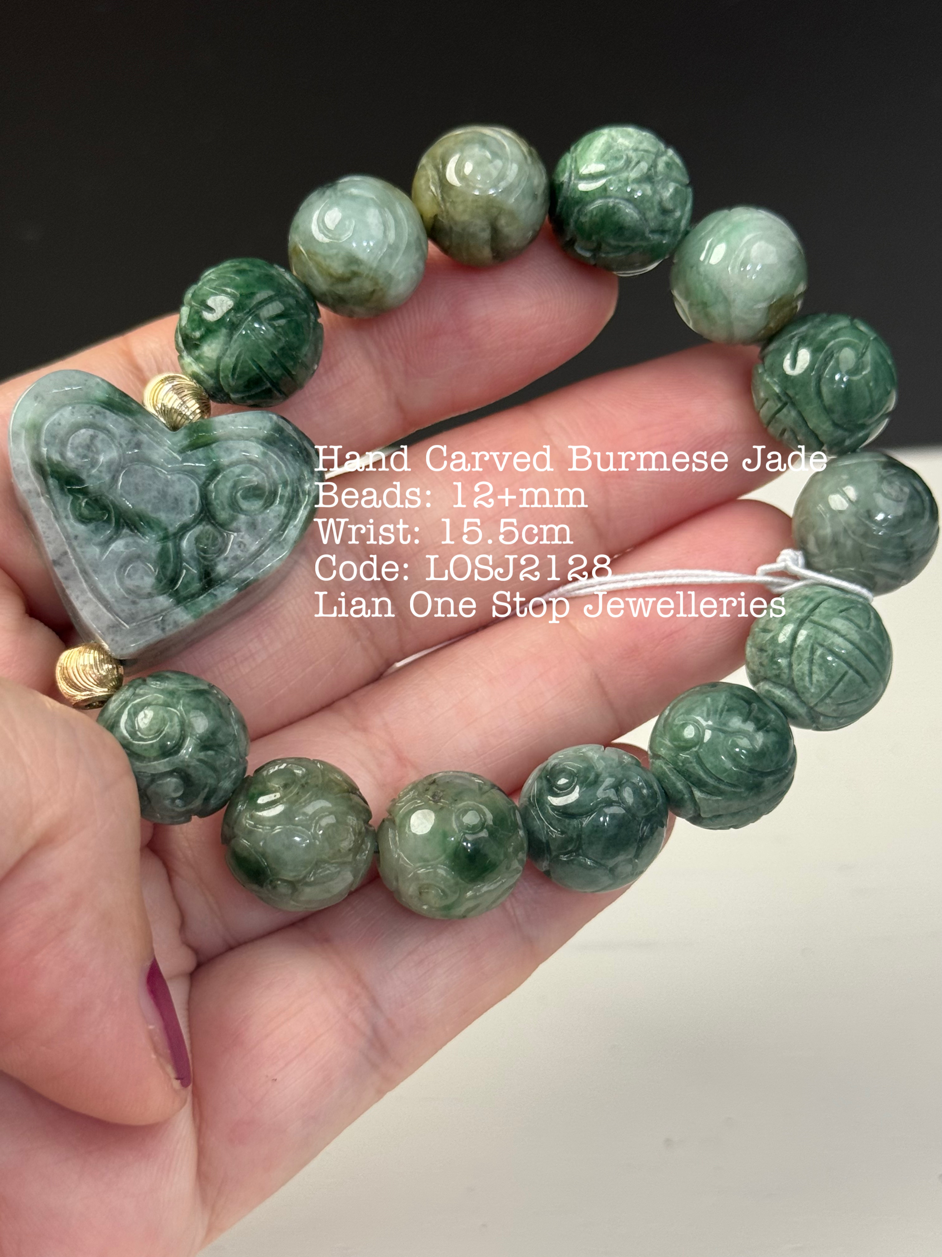 Hand Carved Burmese Jade Beads: 12+mm Wrist: 15.5cm Code: LOSJ2128