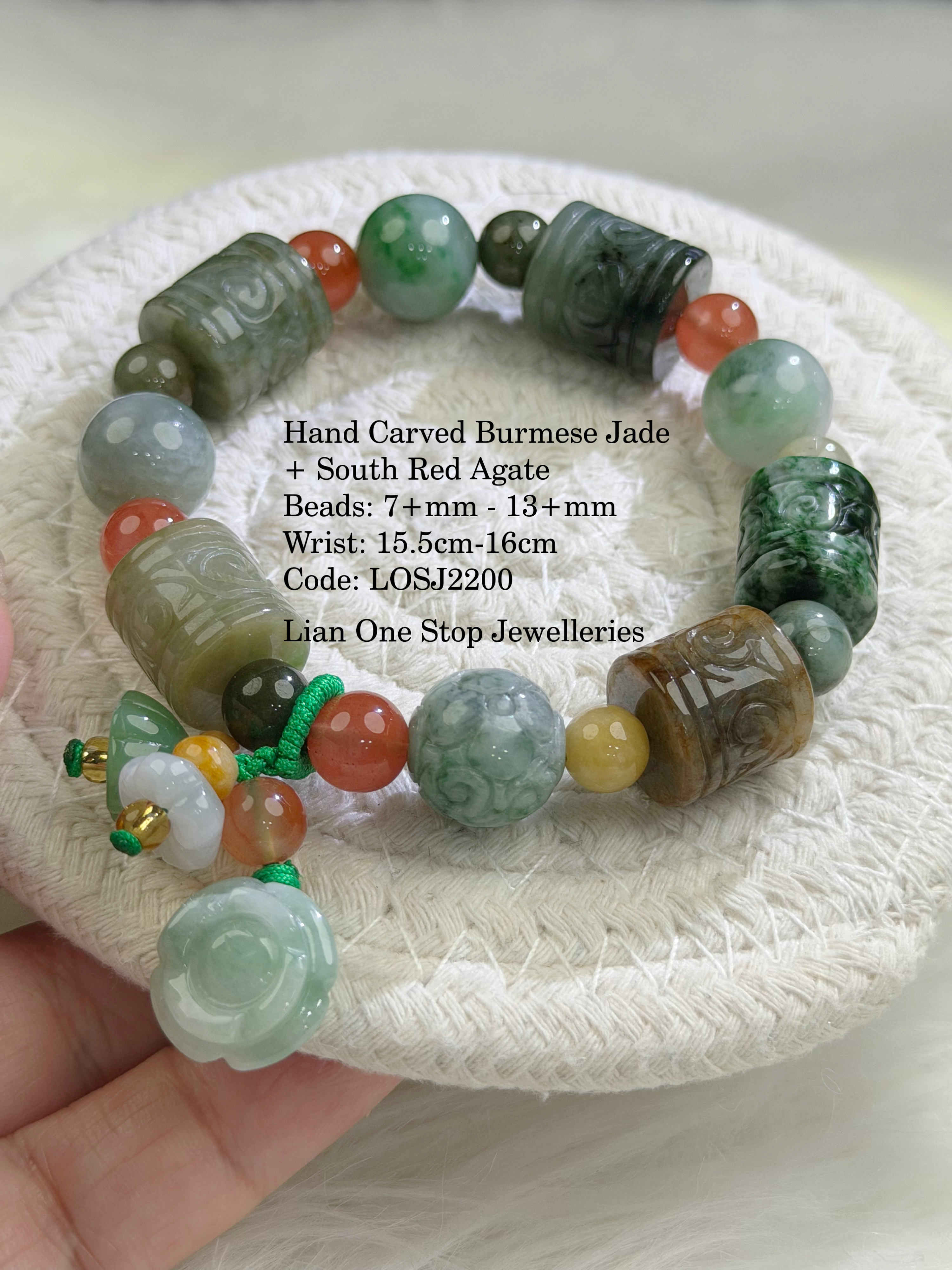 Hand Carved Burmese Jade + South Red Agate Beads: 7+mm - 13+mm Wrist: 15.5cm-16cm Code: LOSJ2200