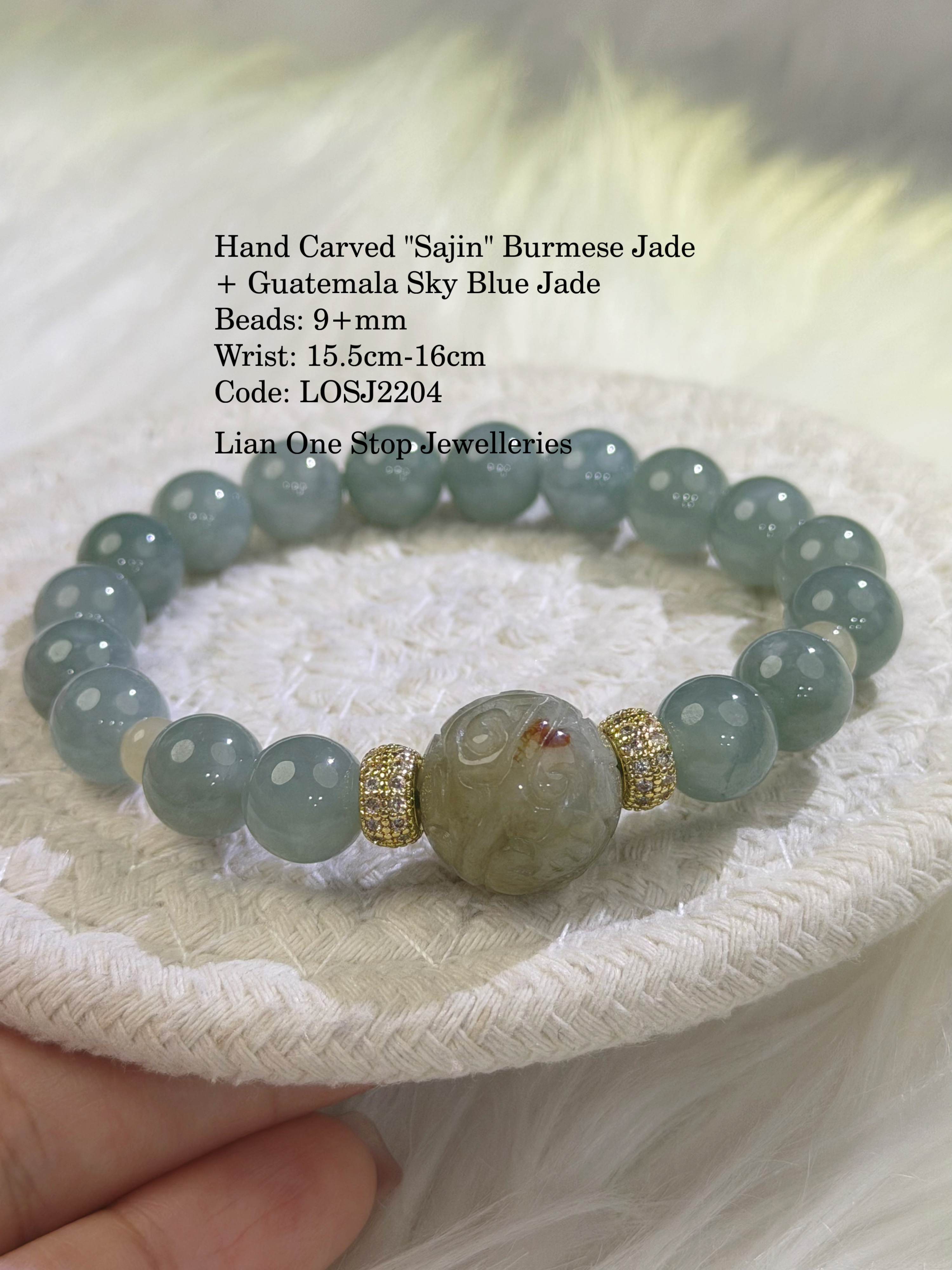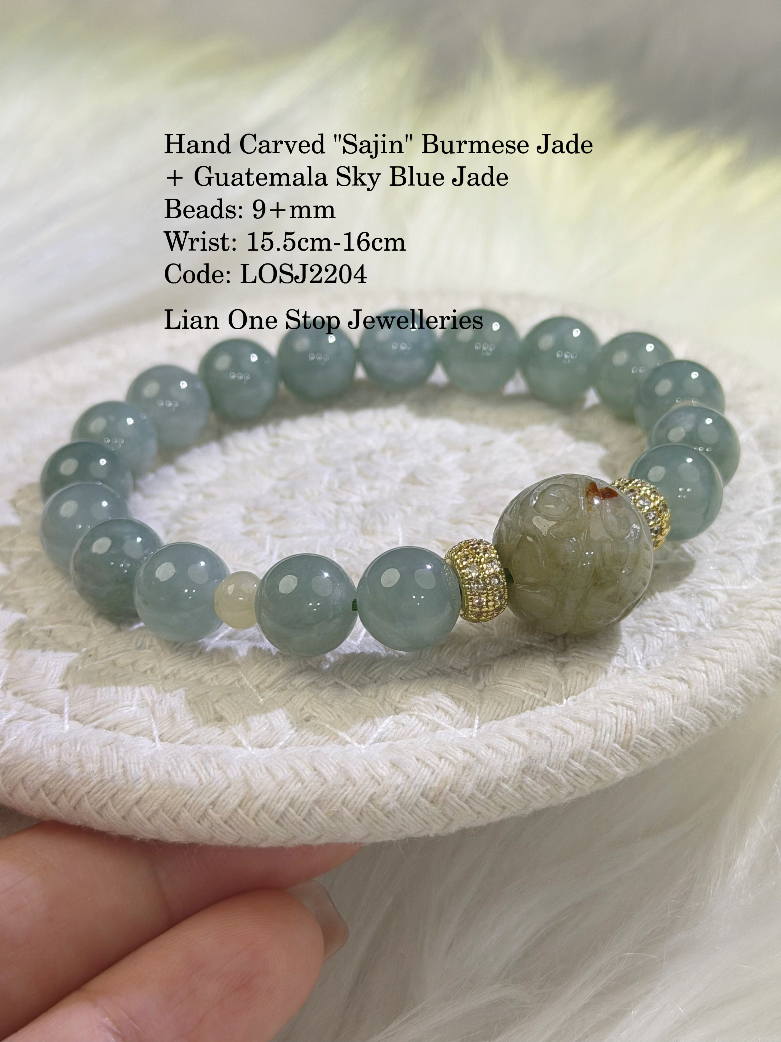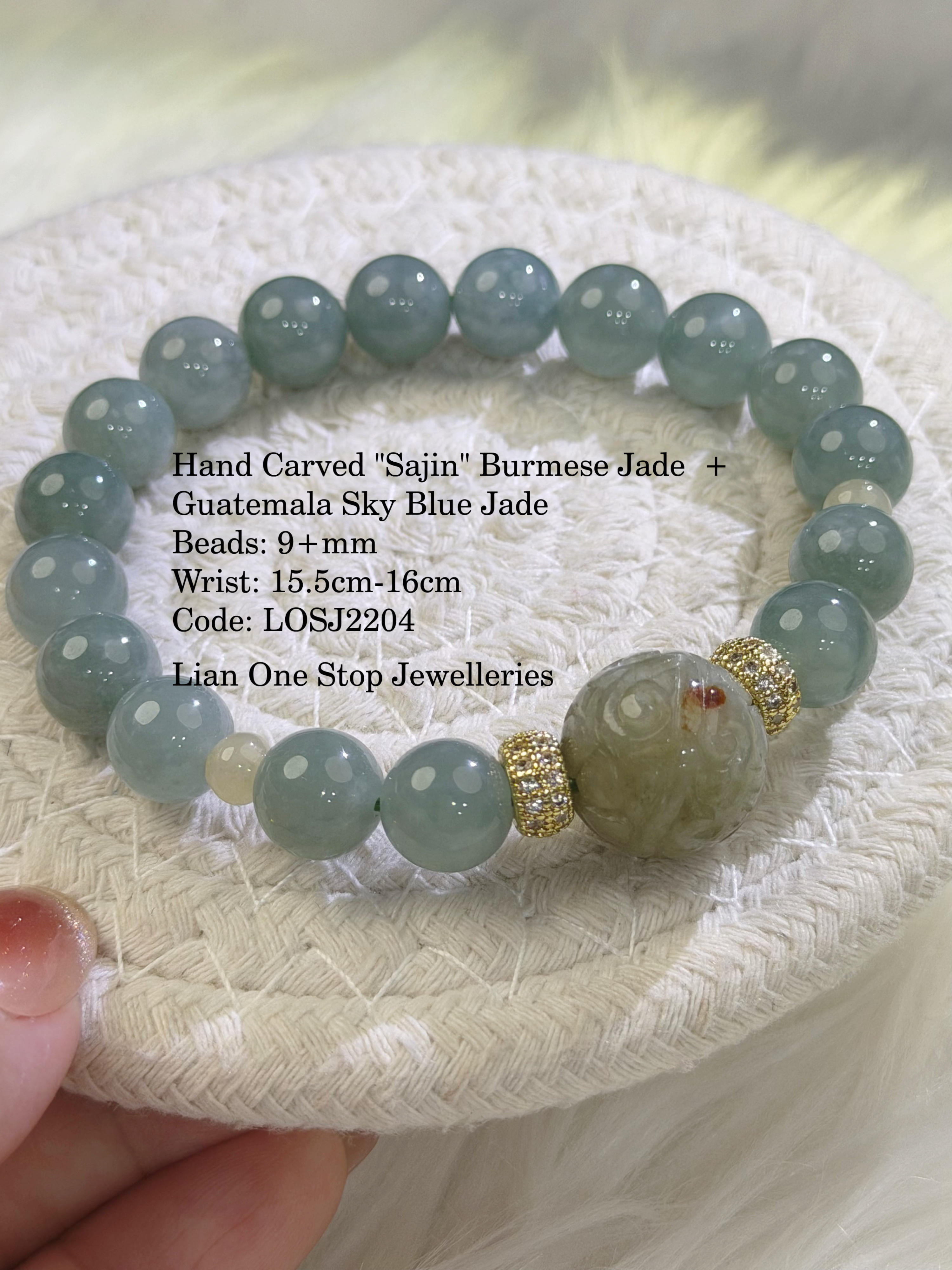 Hand Carved "Sajin" Burmese Jade + Guatemala Sky Blue Jade Beads: 9+mm Wrist: 15.5cm-16cm Code: LOSJ2204