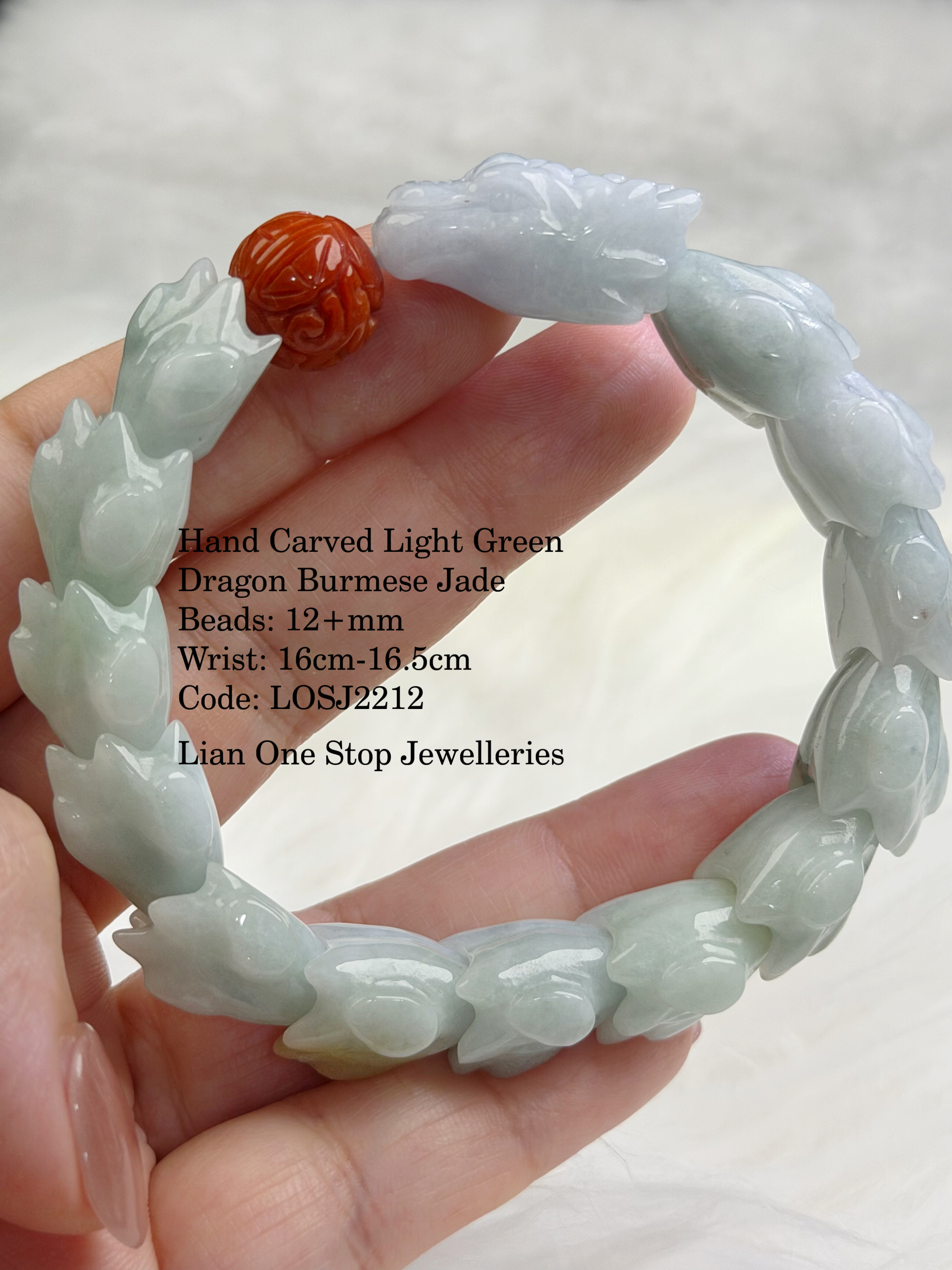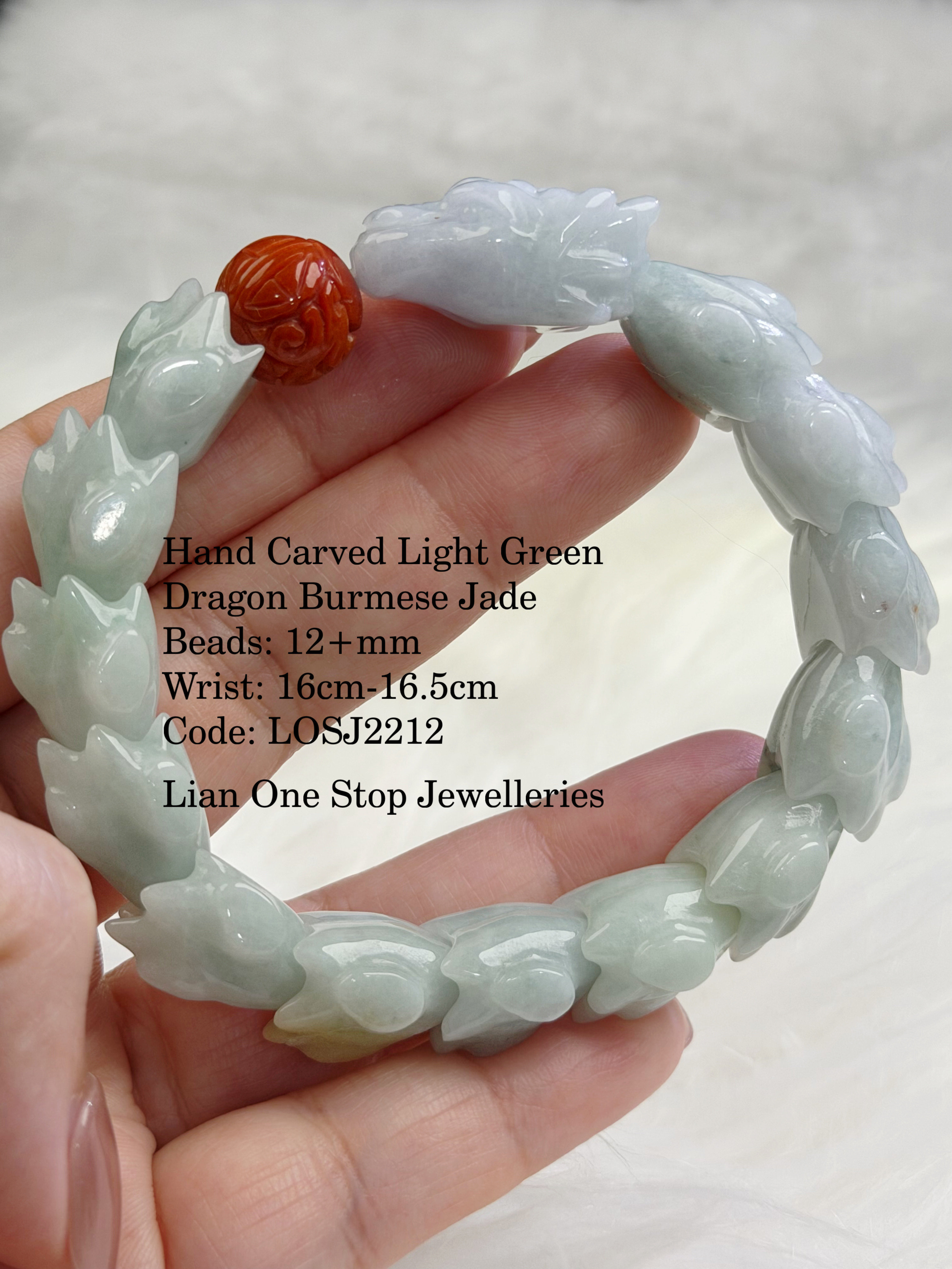 Hand Carved Light Green Dragon Burmese Jade Beads: 12+mm Wrist: 16cm-16.5cm Code: LOSJ2212