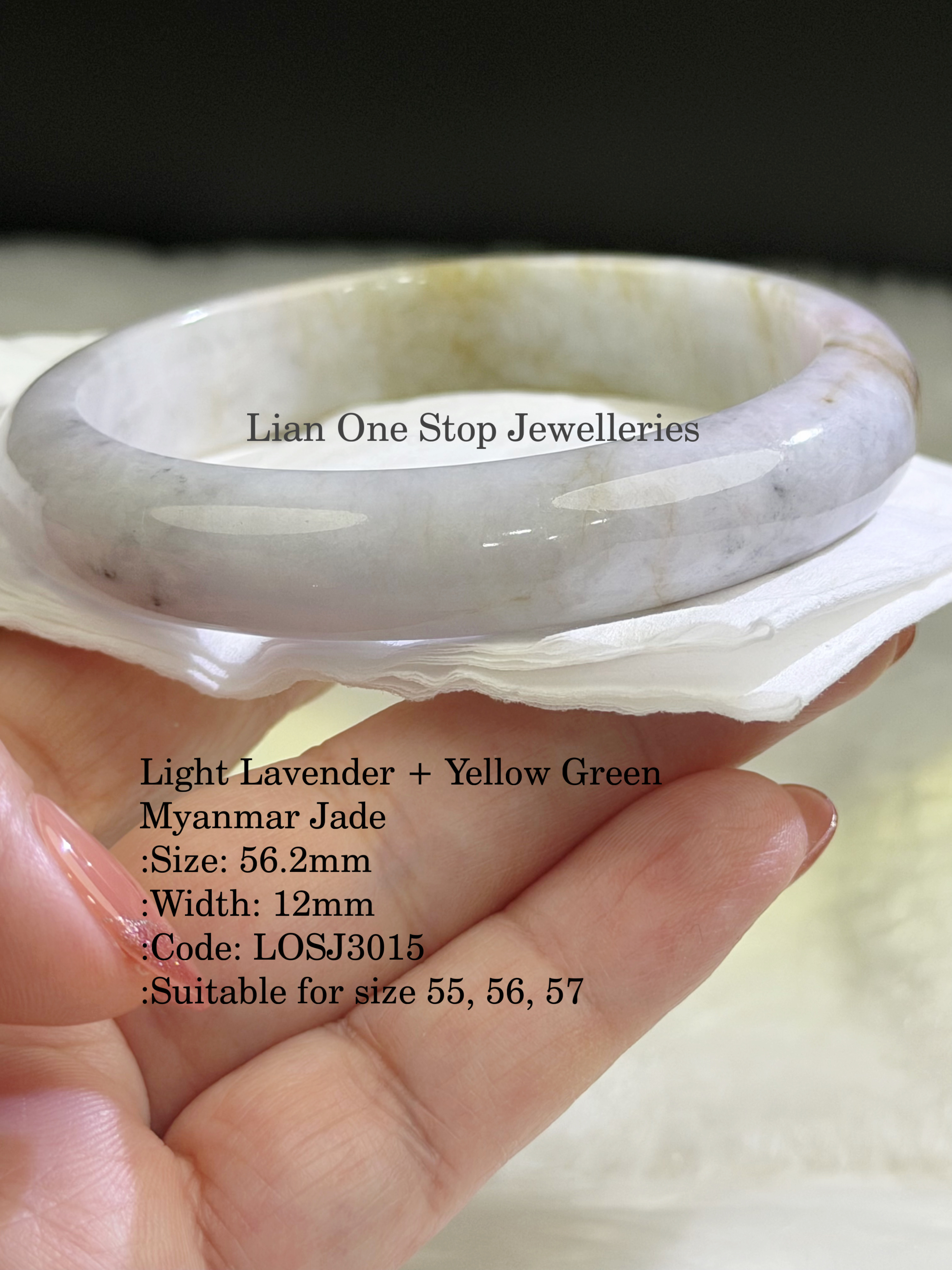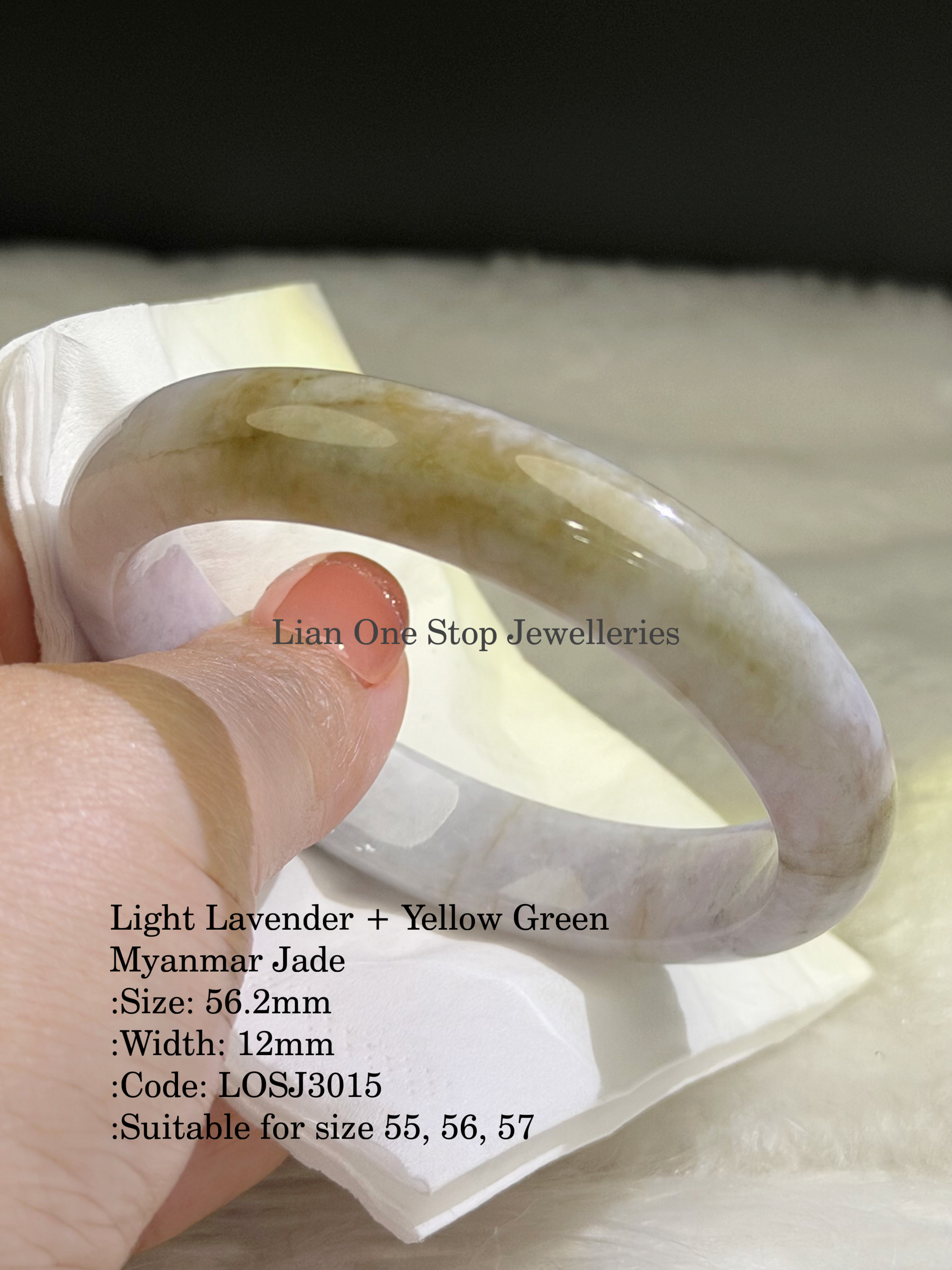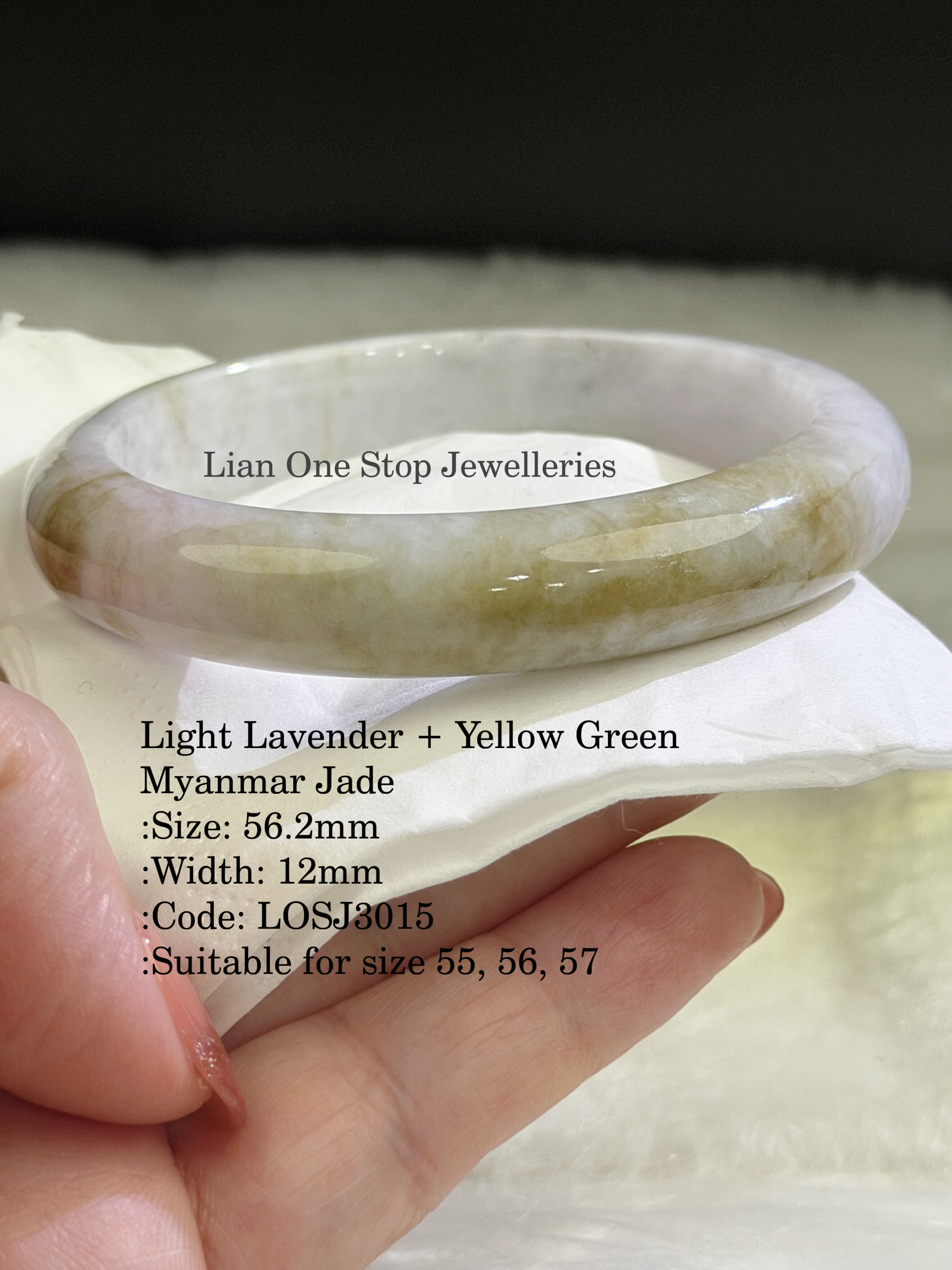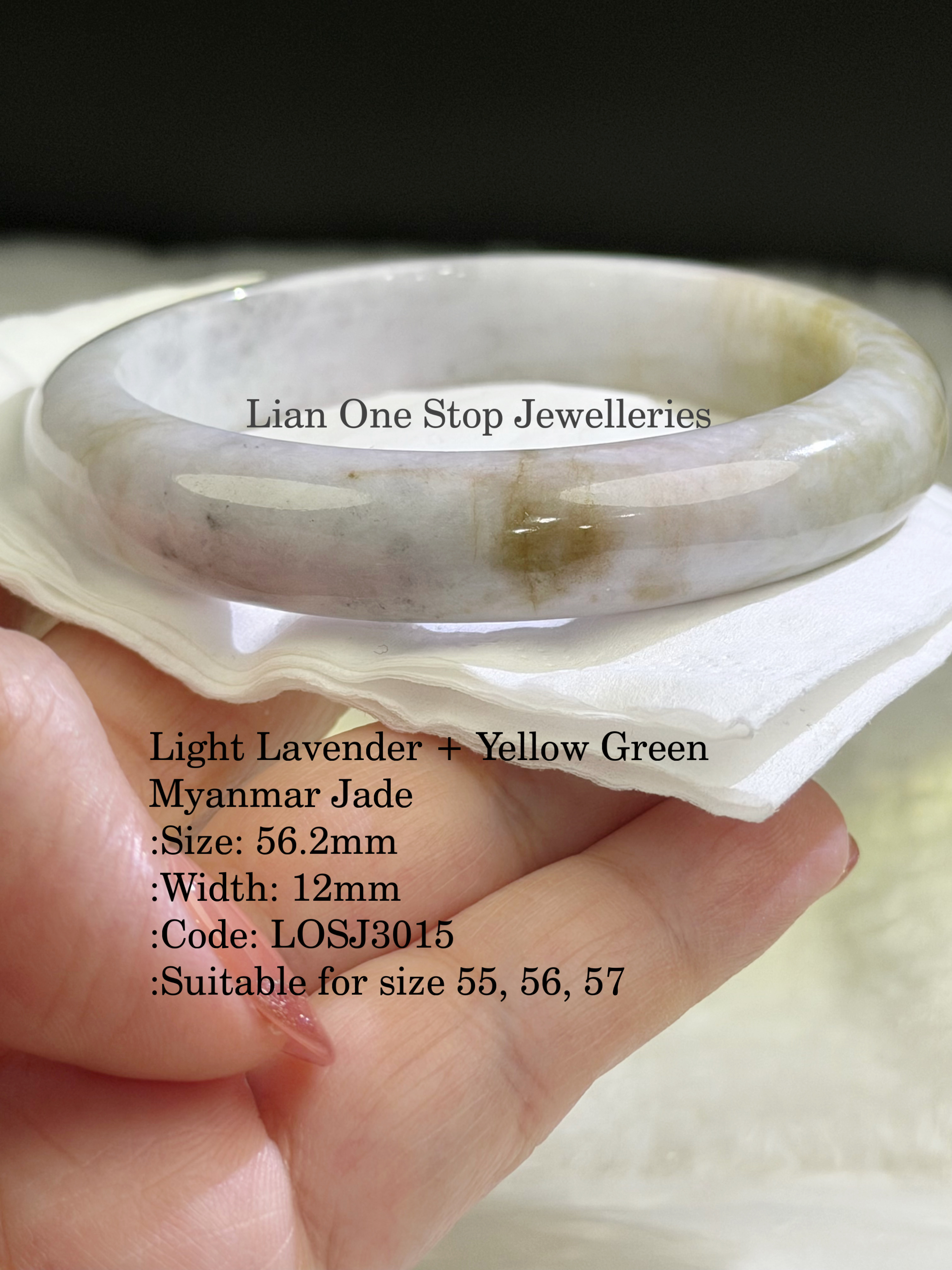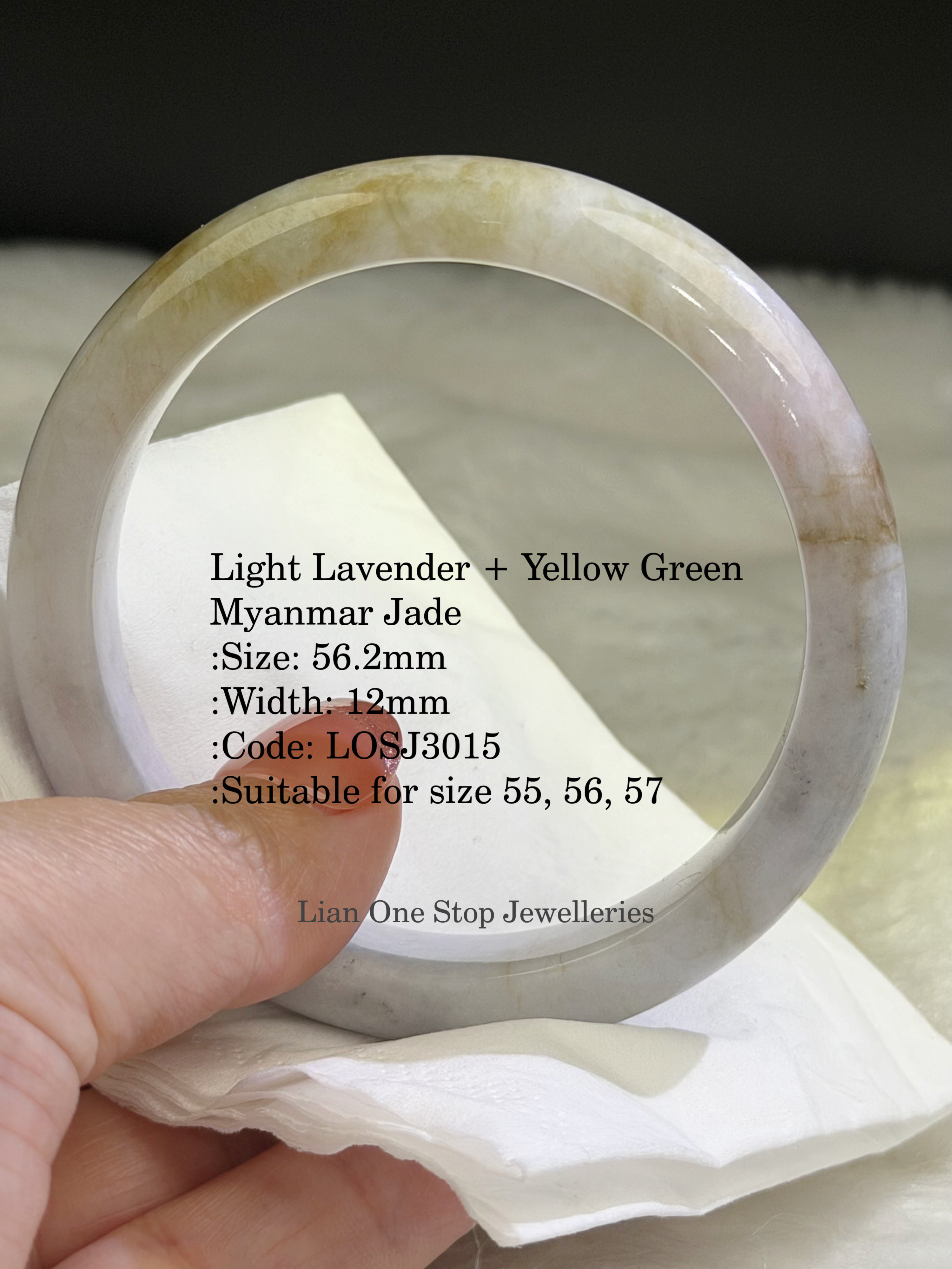 Light Lavender + Yellow Green Myanmar Jade :Size: 56.2mm :Width: 12mm :Code: LOSJ3015 :Suitable for size 55, 56, 57