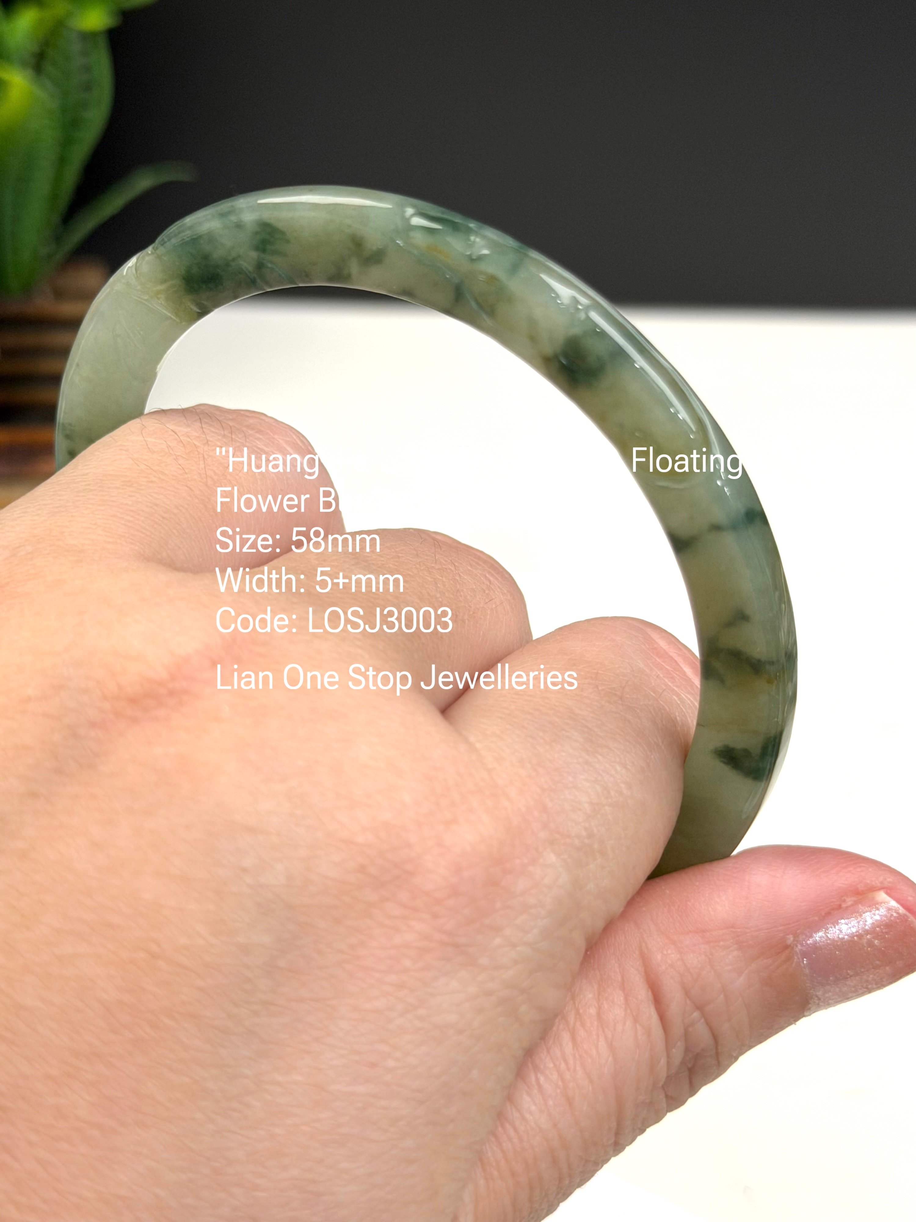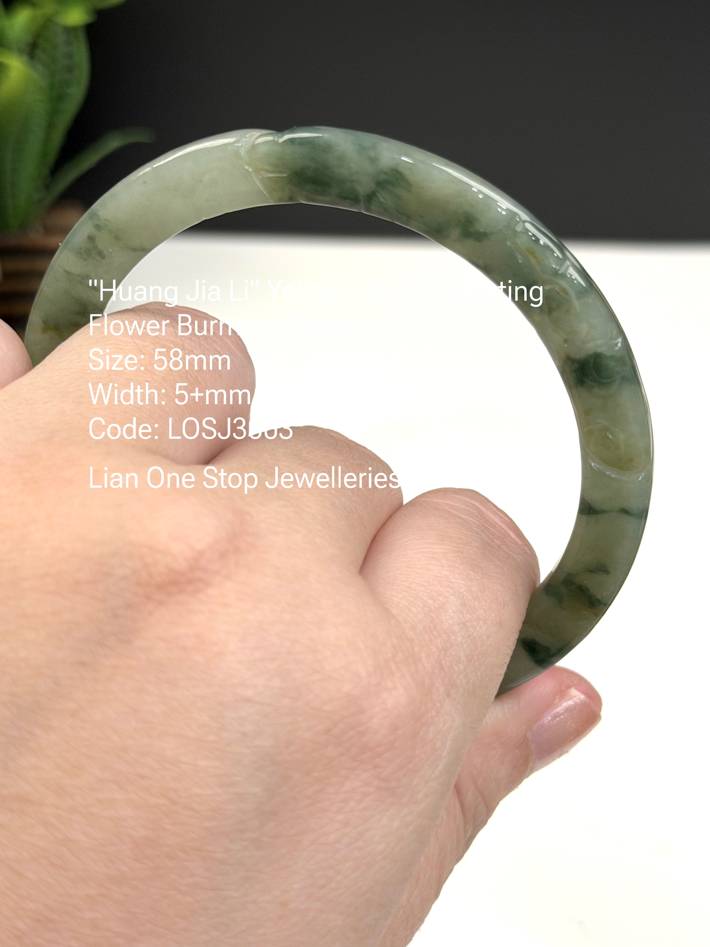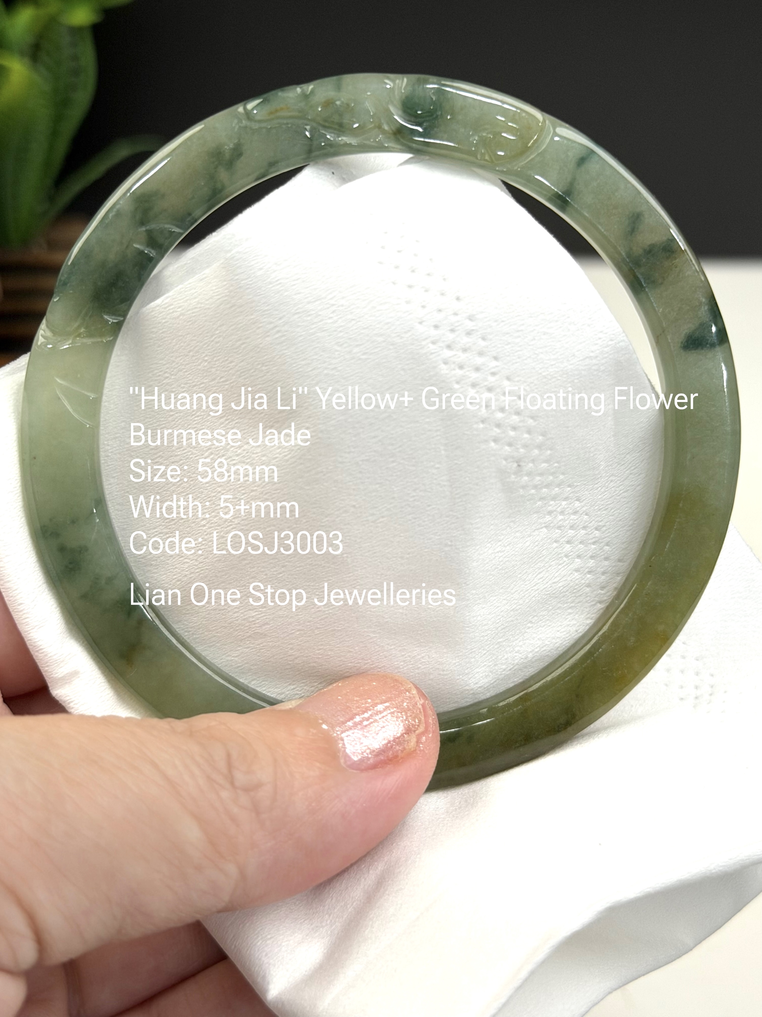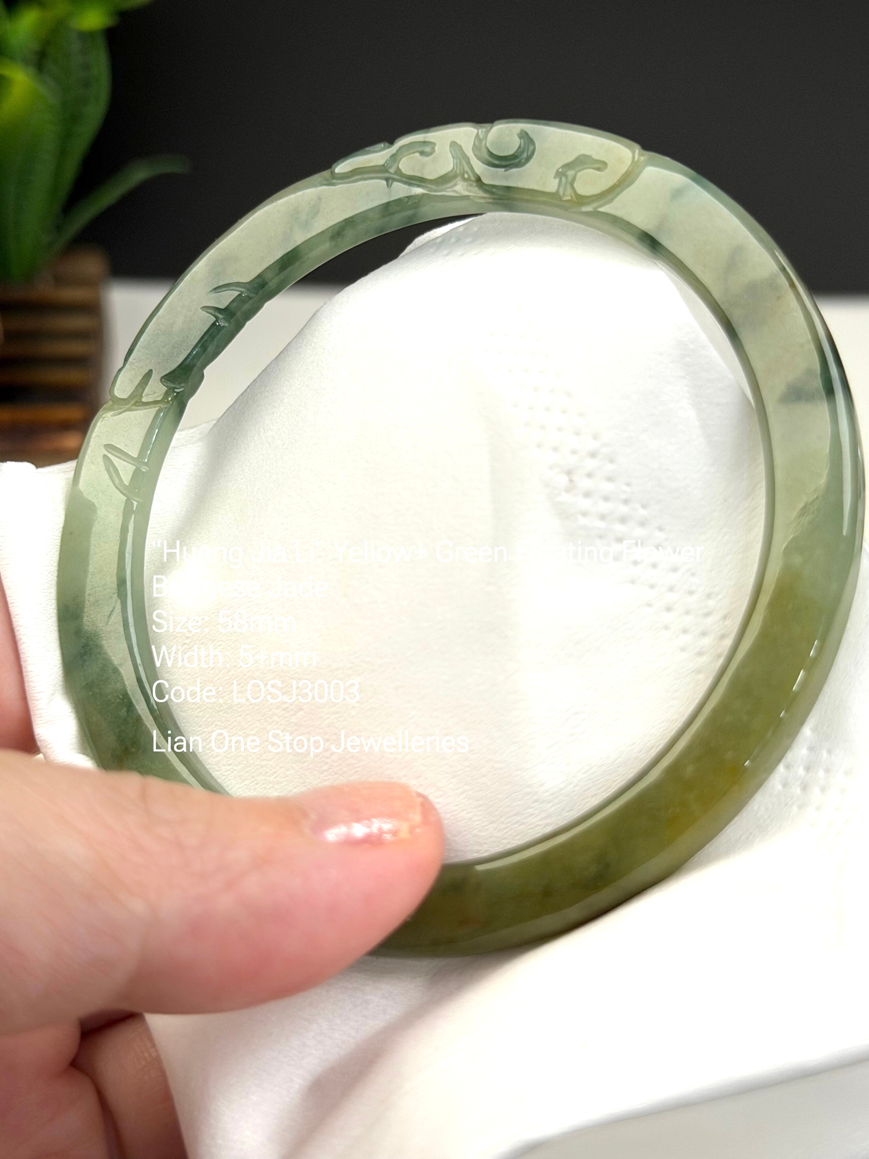 "Huang Jia Li" Yellow+ Green Floating Flower Burmese Jade Size: 58mm Width: 5+mm Code: LOSJ3003