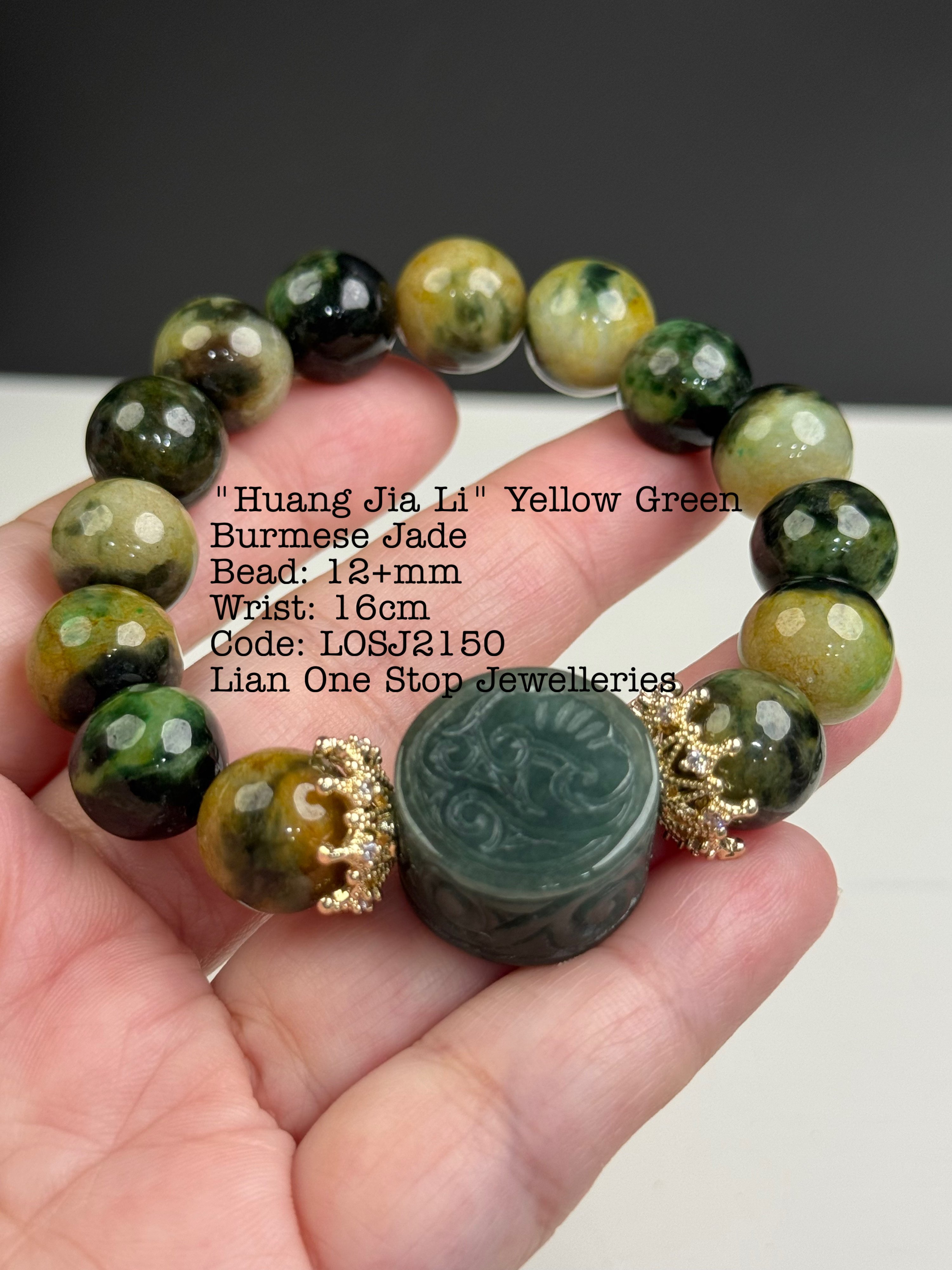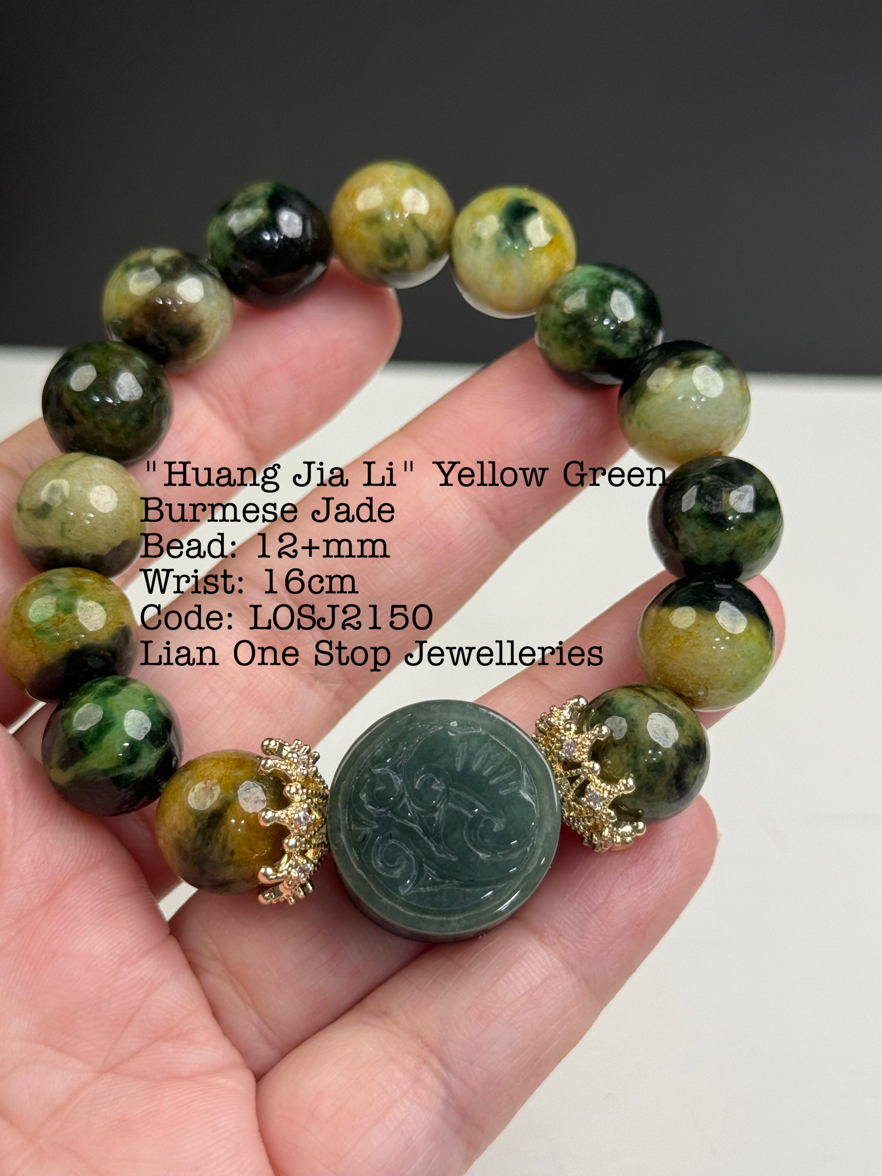 Code: LOSJ2150 "Huang Jia Li" Yellow Green Burmese Jade 12+mm