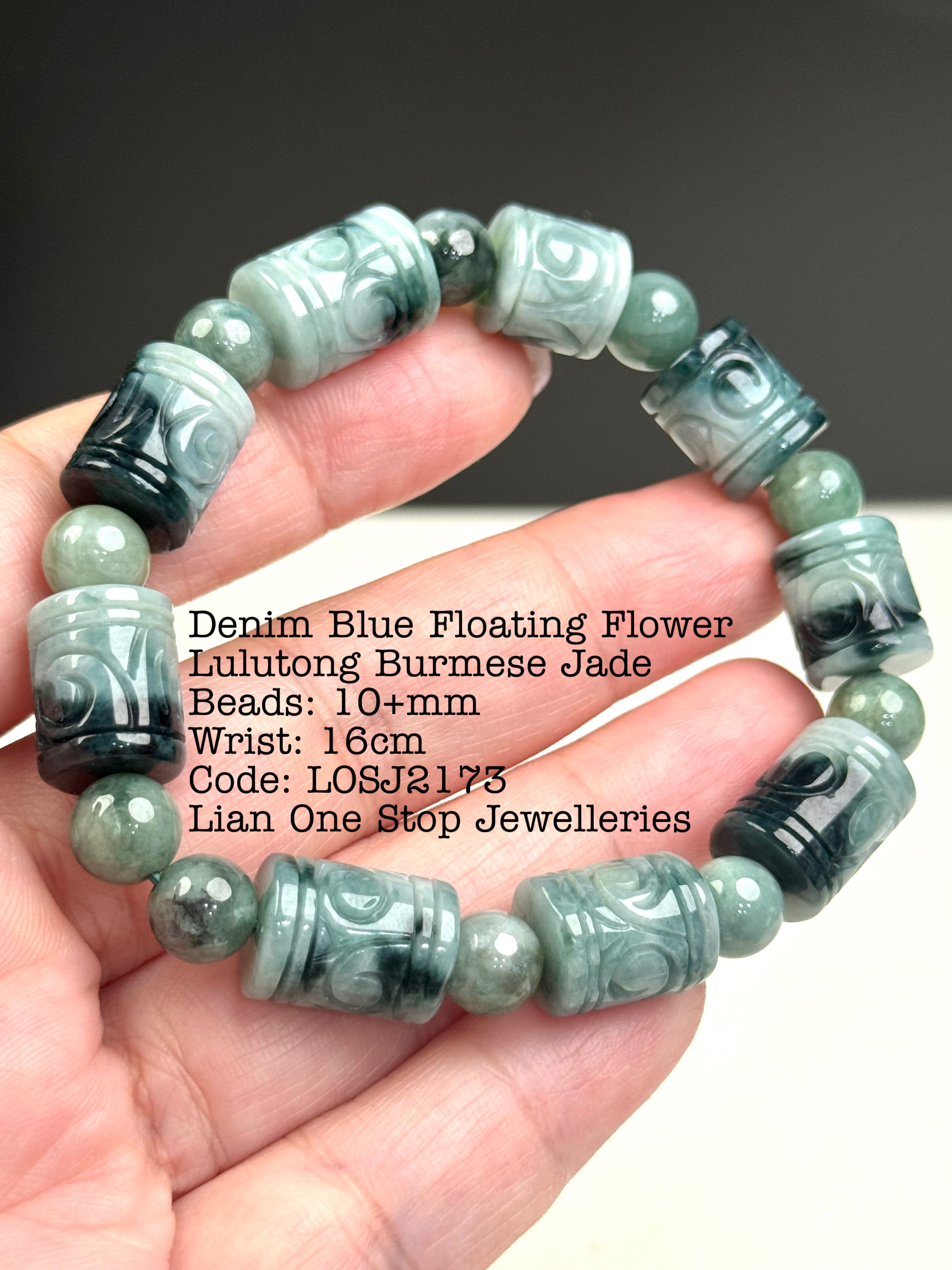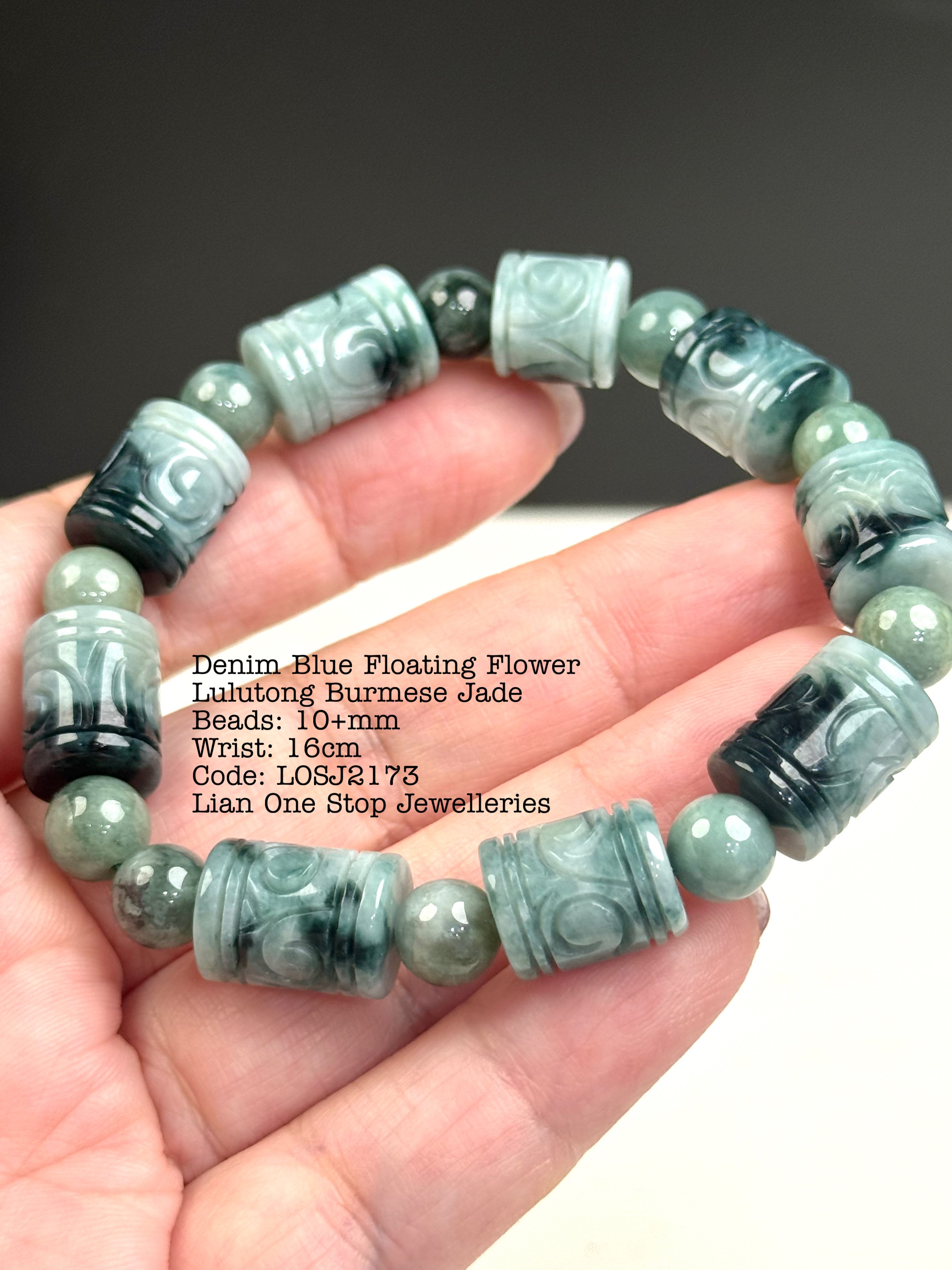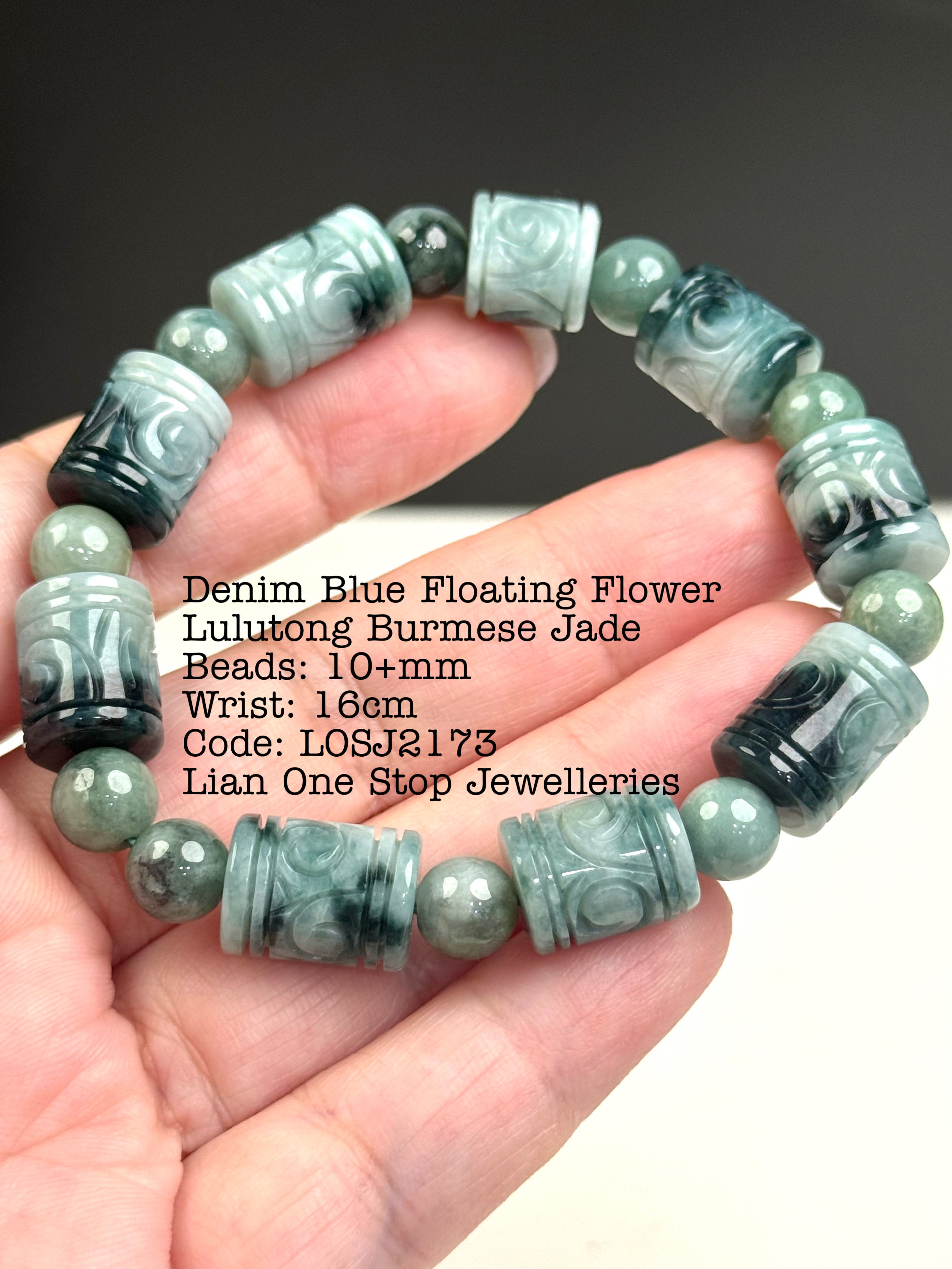 Denim Blue Floating Flower Lulutong Burmese Jade Beads: 10+mm Wrist: 16cm Code: LOSJ2173