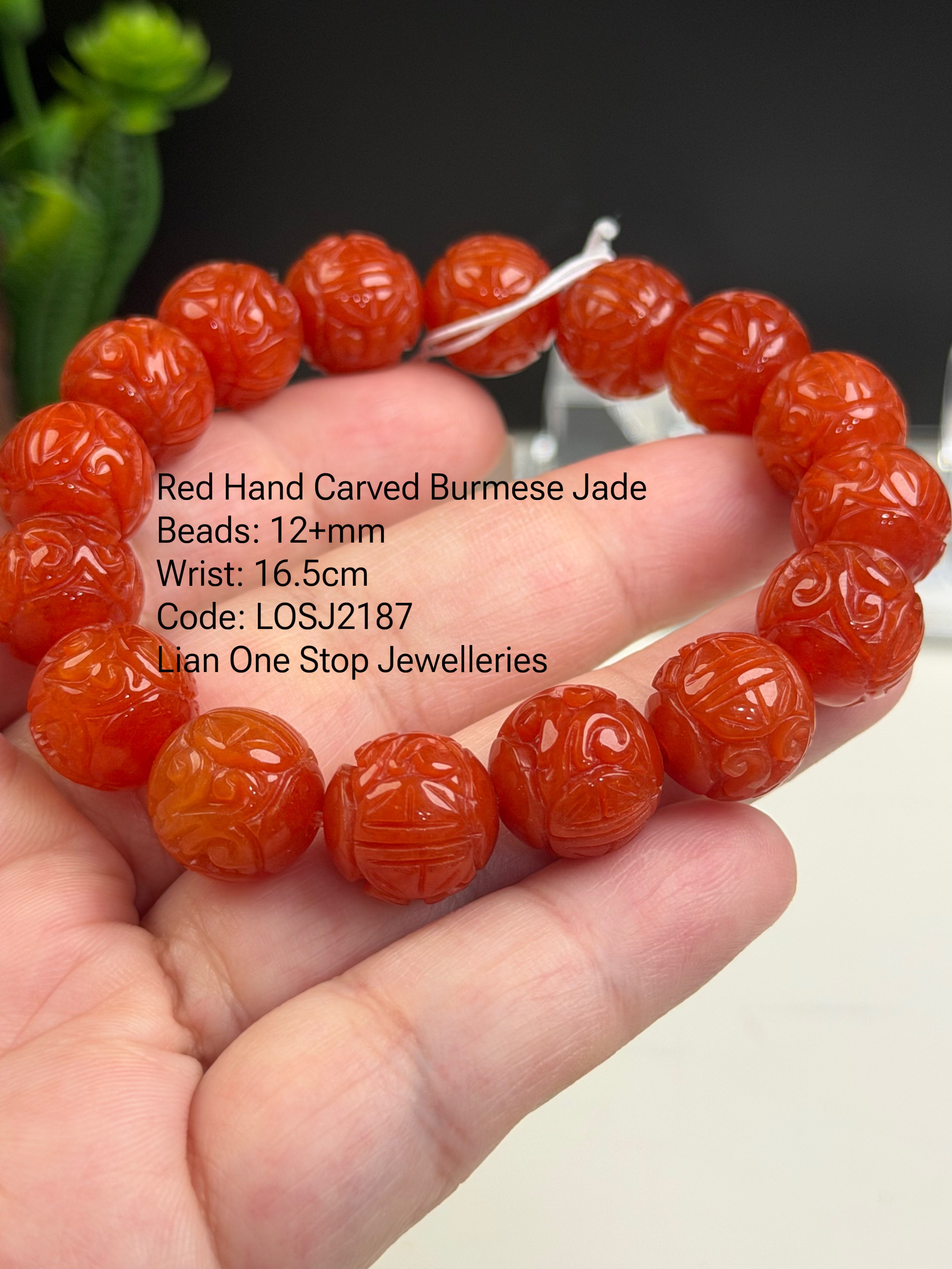 Red Hand Carved Burmese Jade Beads: 12+mm Wrist: 16.5cm Code: LOSJ2187