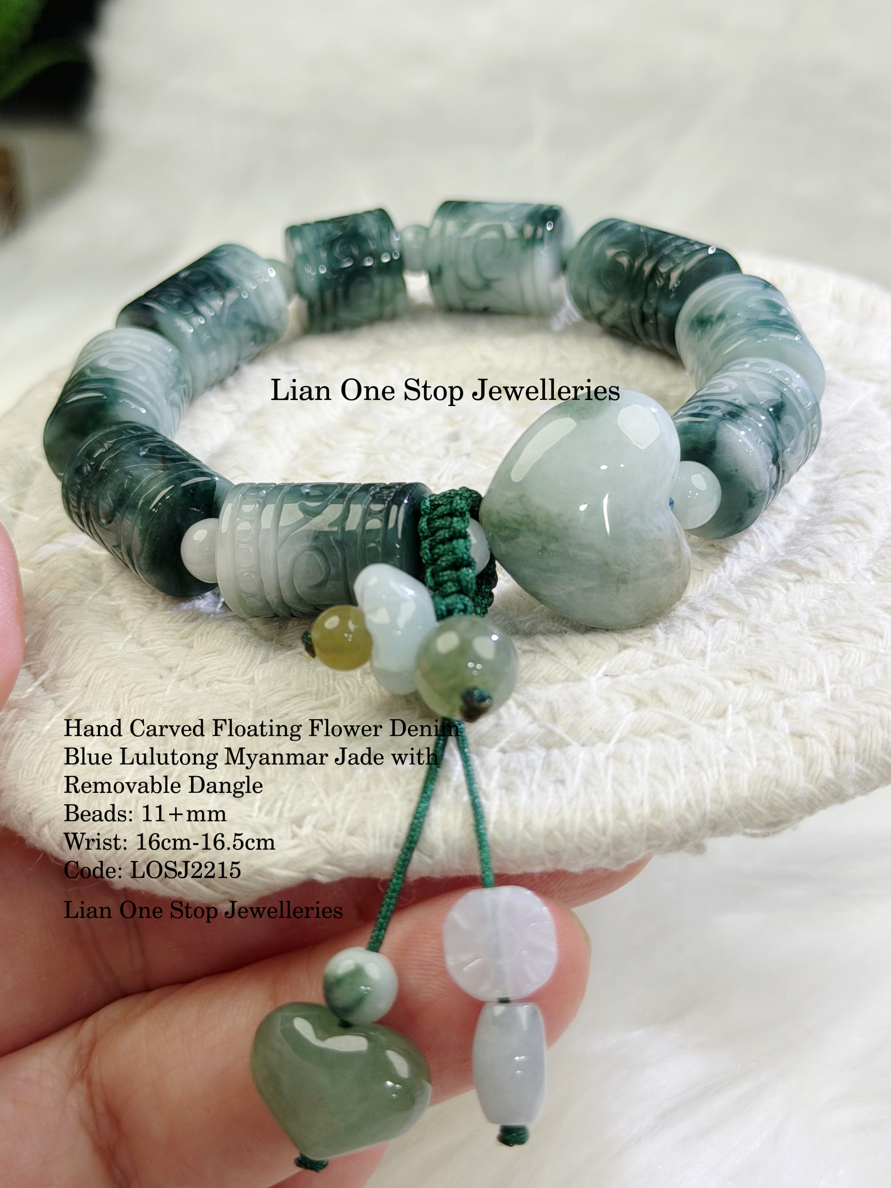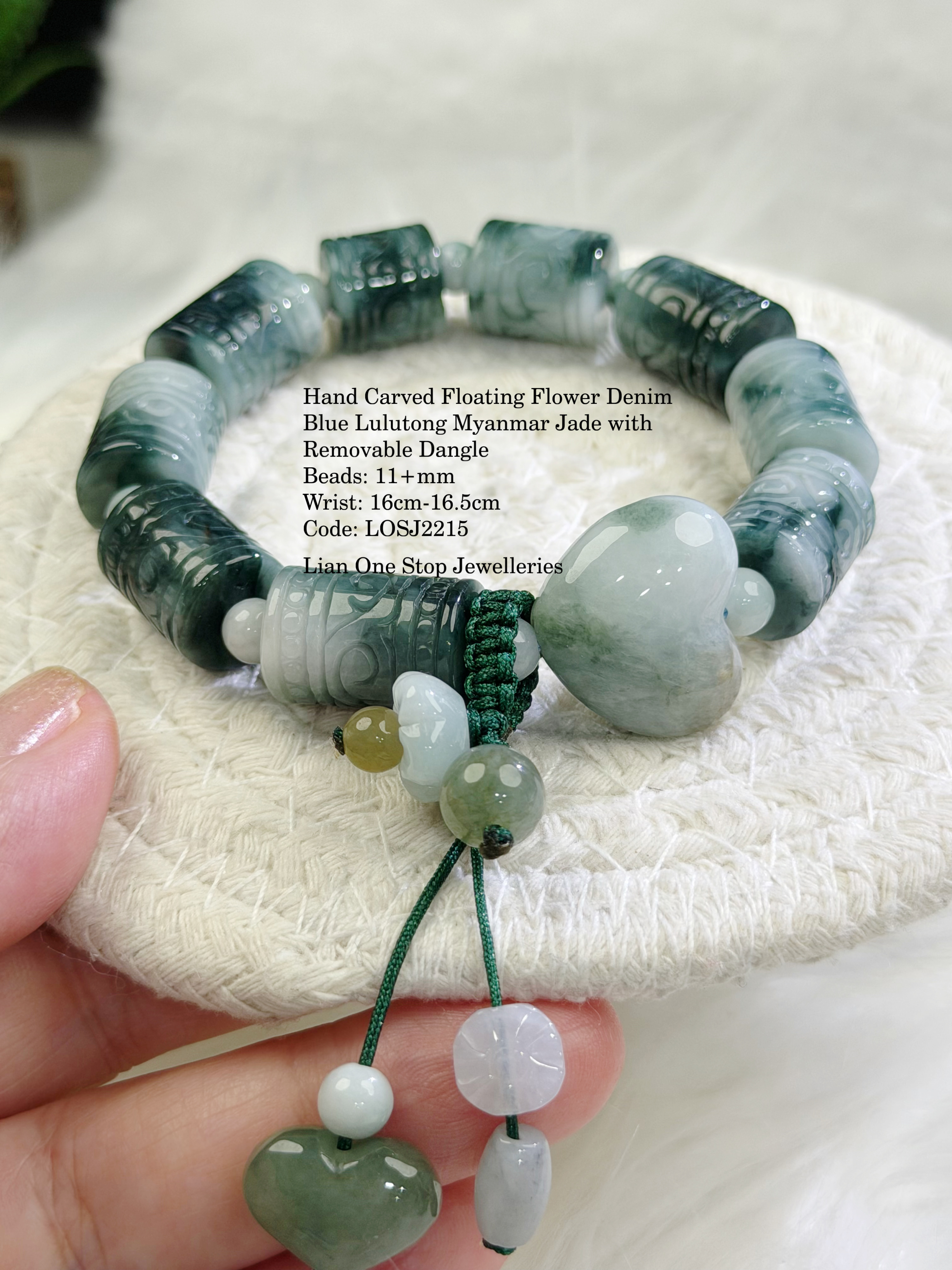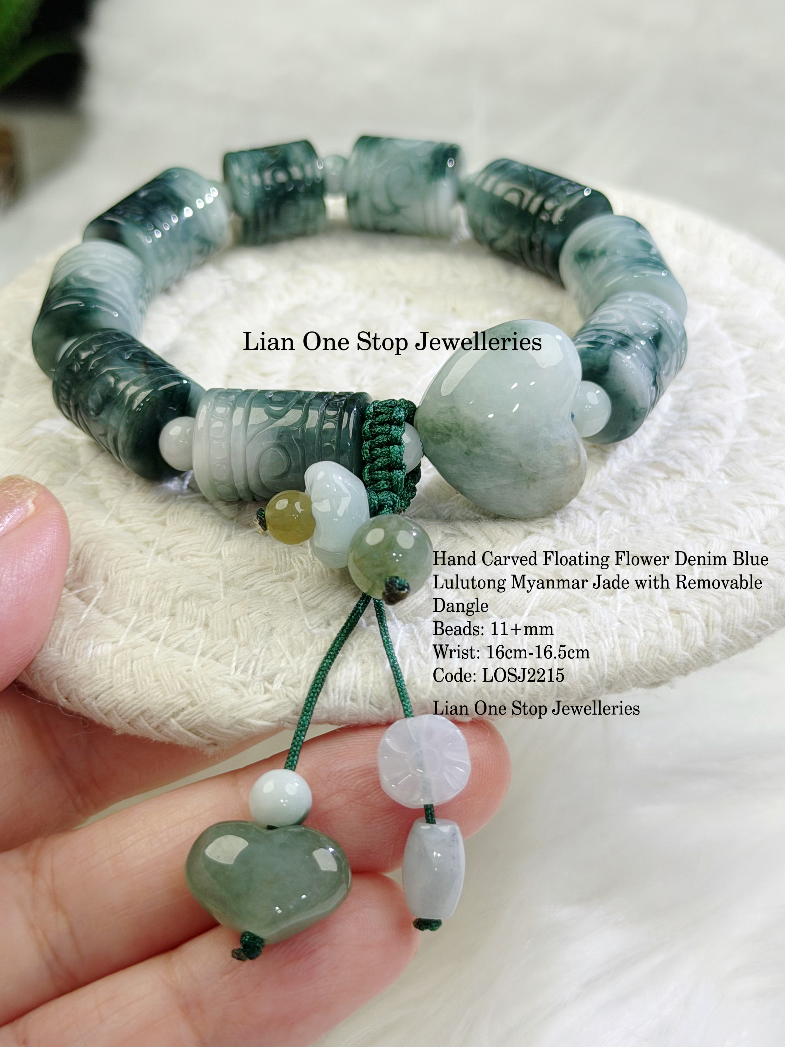 Hand Carved Floating Flower Denim Blue Lulutong Myanmar Jade with Removable Dangle Beads: 11+mm Wrist: 16cm-16.5cm Code: LOSJ2215